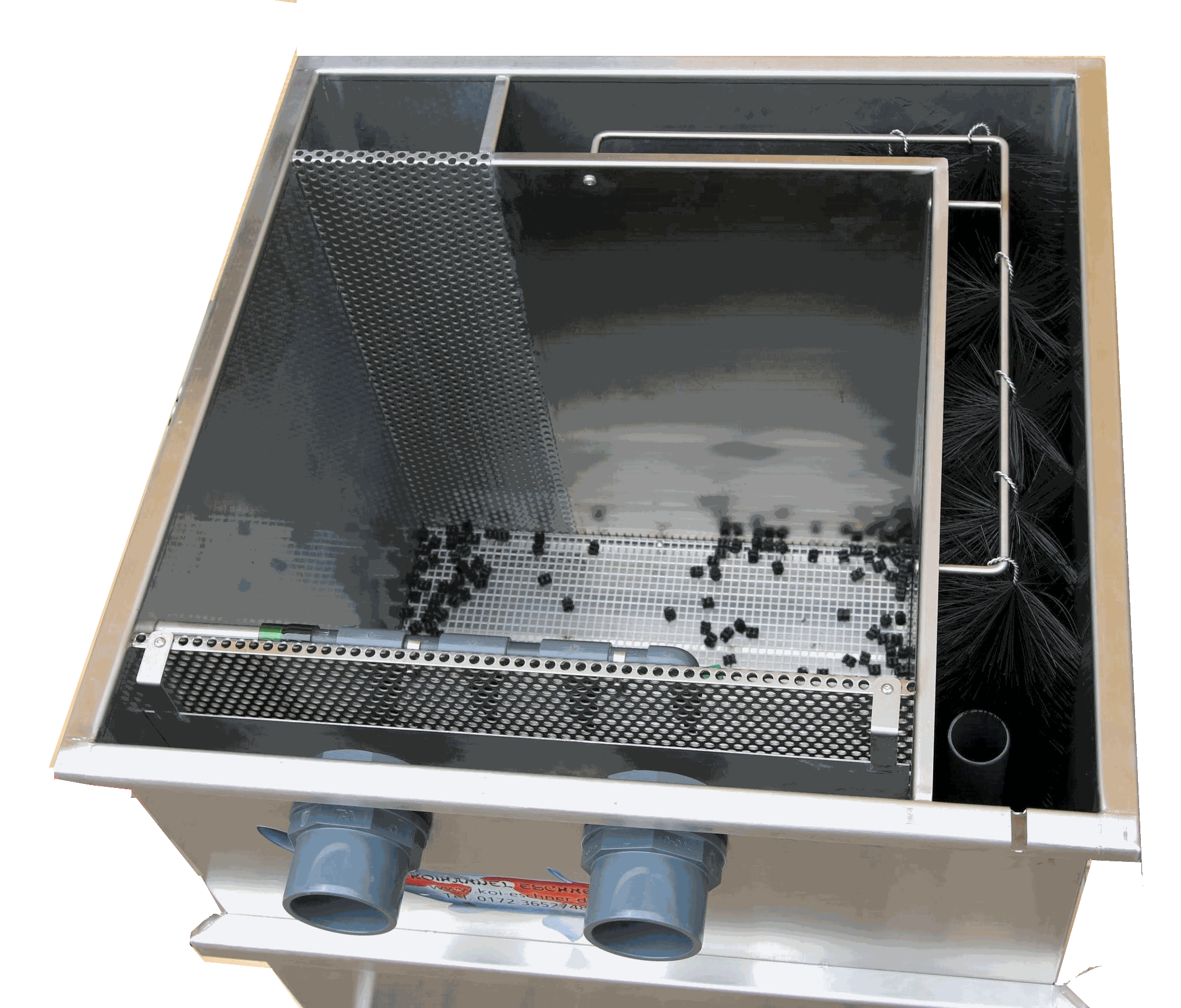 - mechanischer Vorfilter: Bürsten (leichte Reinigung und Unterstützung der biologischen Stufe)