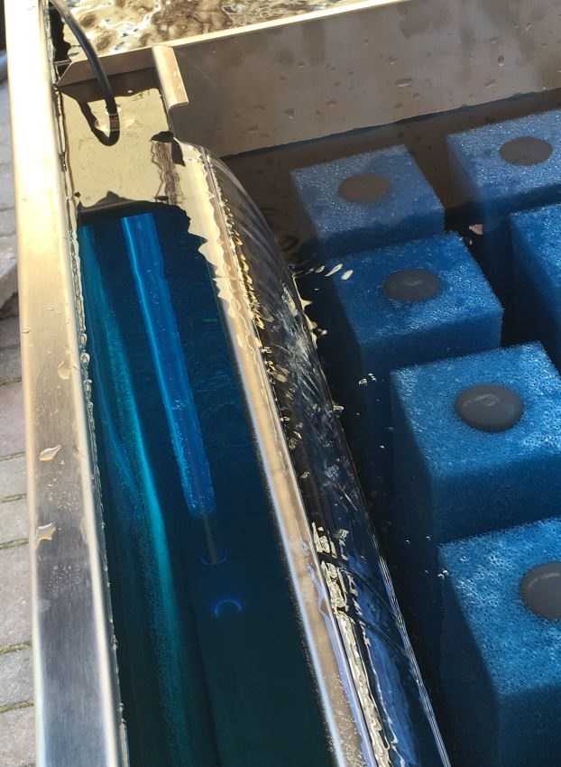 - breiter geräucharmer Wasserfall, steuerbar durch 10.000 Liter pro Stunde regelbare Pumpe